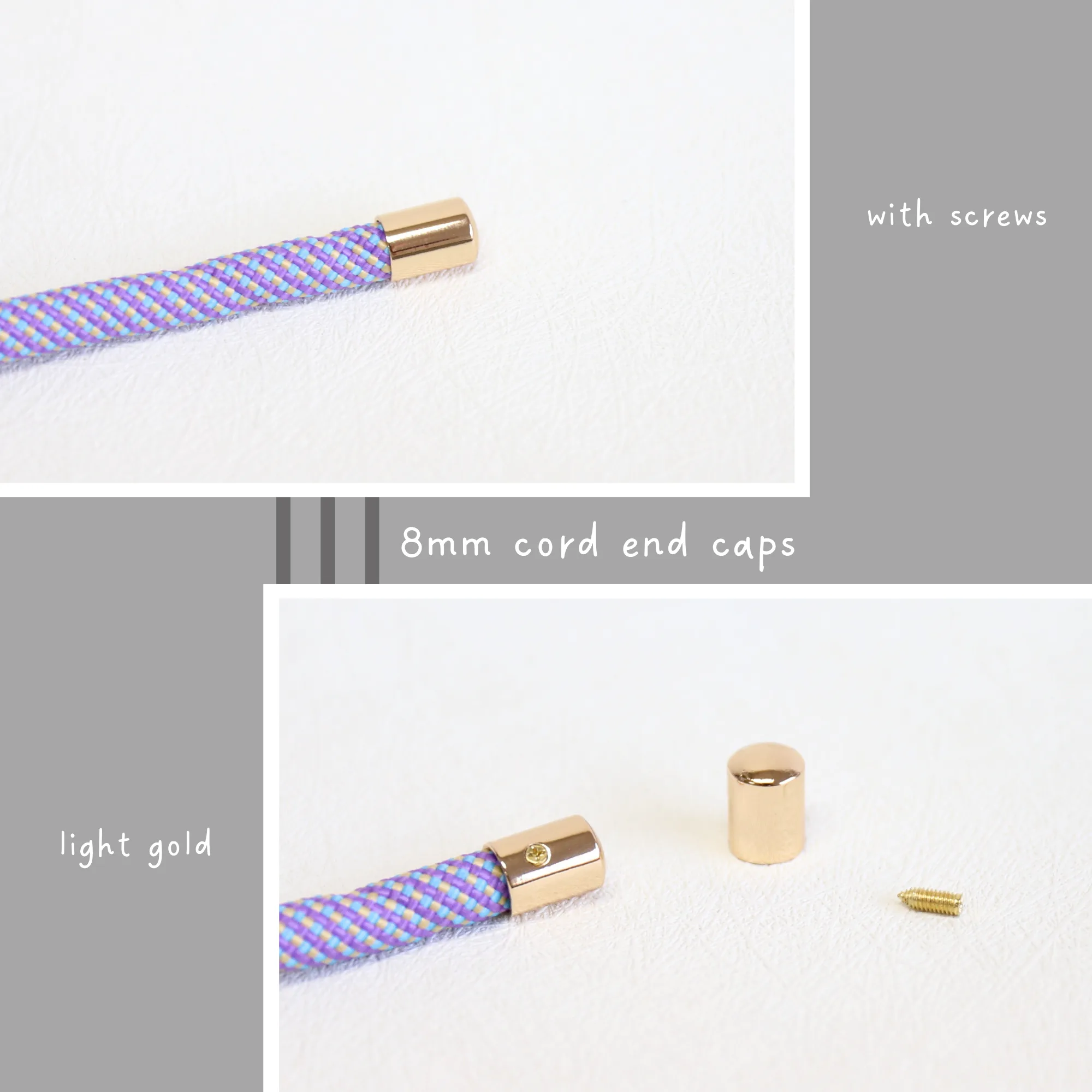 8mm螺絲 繩尾扣,共3色,一件=4個。材質:鋅合金,掛鍍封油,適用於我們的8mm繩,防止繩尾散邊脫線,繩子收尾更美觀,可作為扁繩或布條的繩尾扣,也可用於索繩袋水桶的繩尾。只需擰實螺絲,操作簡單如訂單中有螺絲配件,每張訂單均送一枝小螺絲批 電話繩配件 hardware phone strap parts